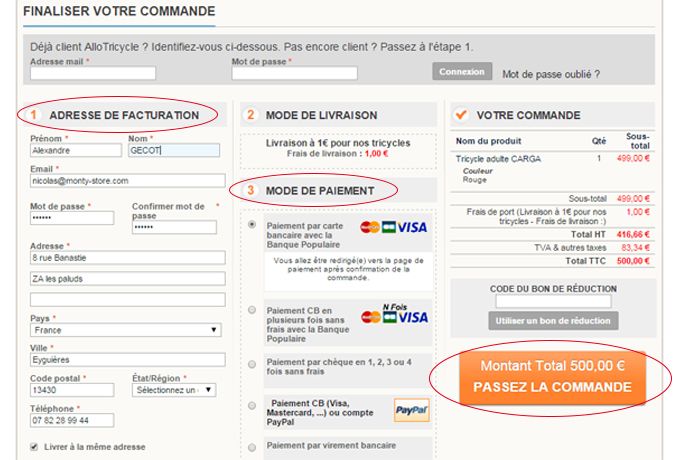 Il ne vous reste plus qu’à finaliser votre commande. Tout d’abord, renseignez vos coordonnées (les frais de livraison seront calculés automatiquement après saisie du pays, de la ville et du code postal). Ensuite, choisissez le mode de paiement qui vous convient parmi les différentes options à votre disposition. Enfin, cliquez sur « PASSER LA COMMANDE »