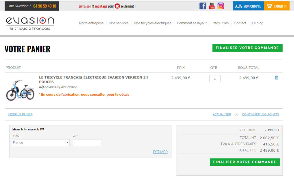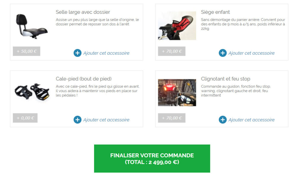 Configurez votre tricycle en sélectionnant les options souhaitées et descendez en bas de page pour y trouver le bouton vert « Finalisez votre commande », cliquez dessus.