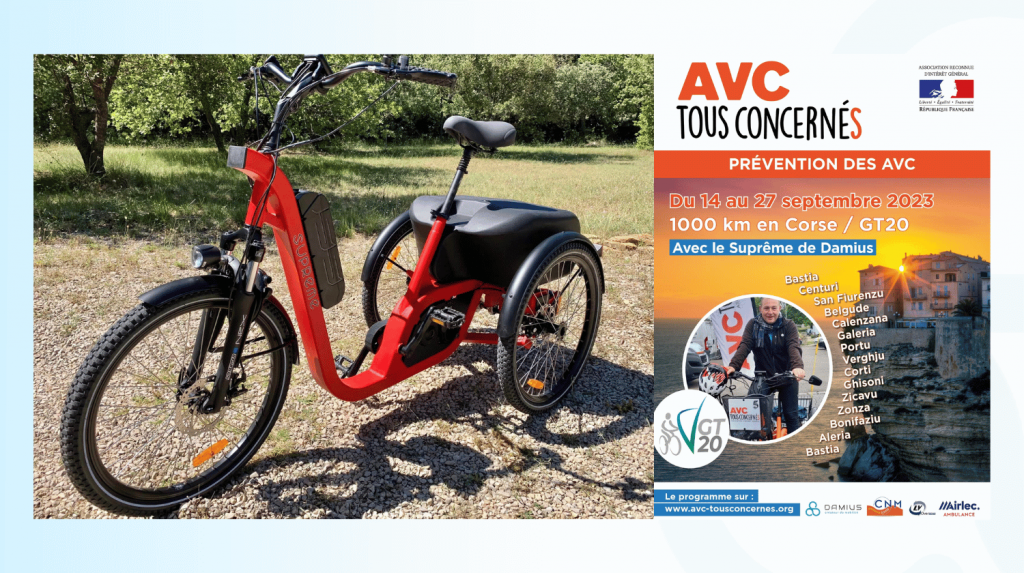 Nous vous l’indiquions dans notre article intitulé « TOUS ENSEMBLE EN TRICYCLE DAMIUS POUR LA PREVENTION DES AVC AVEC PHILIPPE MEYNARD ! » spécialement dédié à Philippe MEYNARD et son aventure sur nos tricycles pour faire la prévention de la lutte contre les AVC, Phillipe s’est lancé l’objectif de réaliser en Septembre 2023 le « GT20 » de Corse sur un parcours de plus de 1000 km, avec d’importants dénivelés et une endurance renforcée, au guidon notre nouveau tricycle SUPREME DAMIUS.