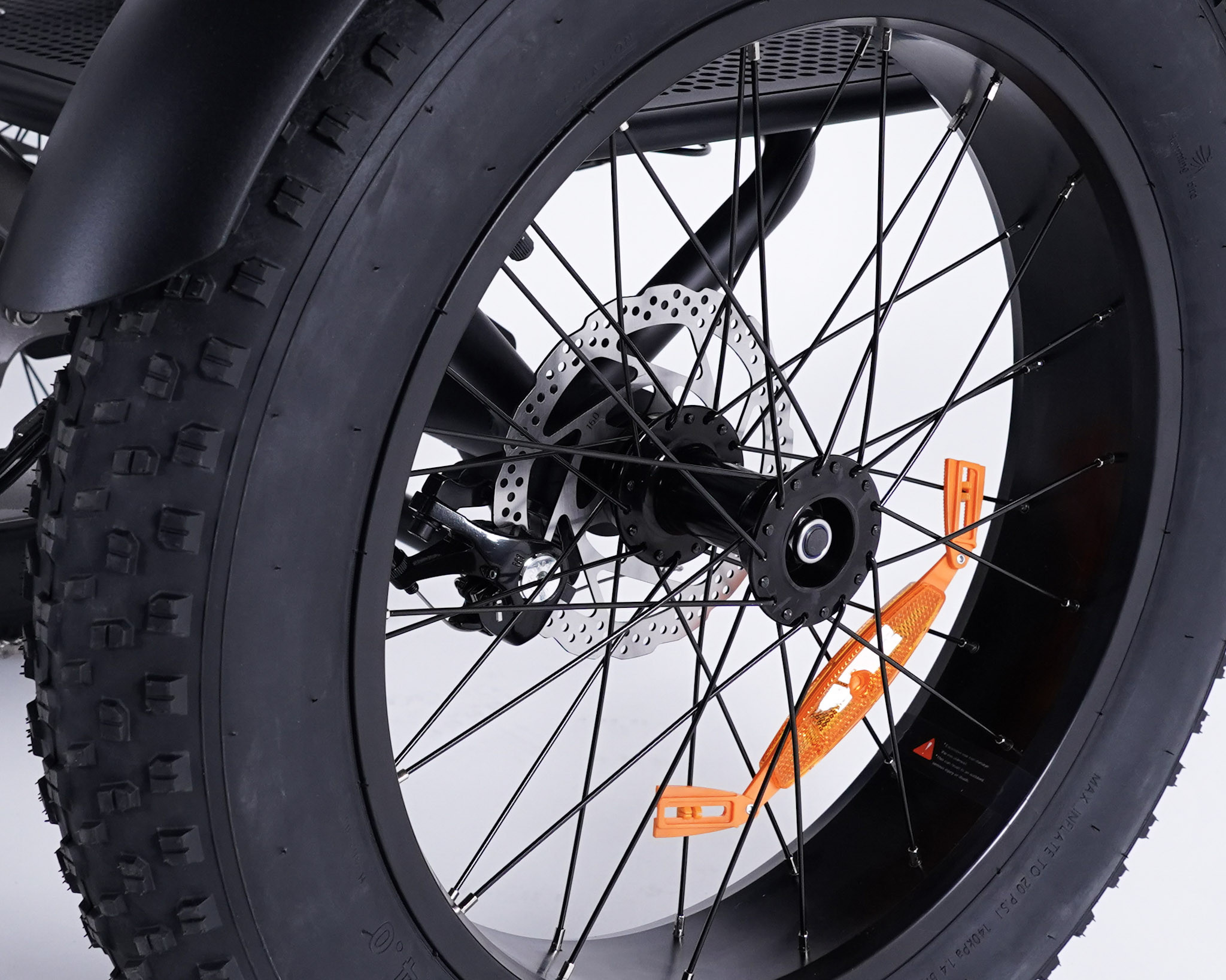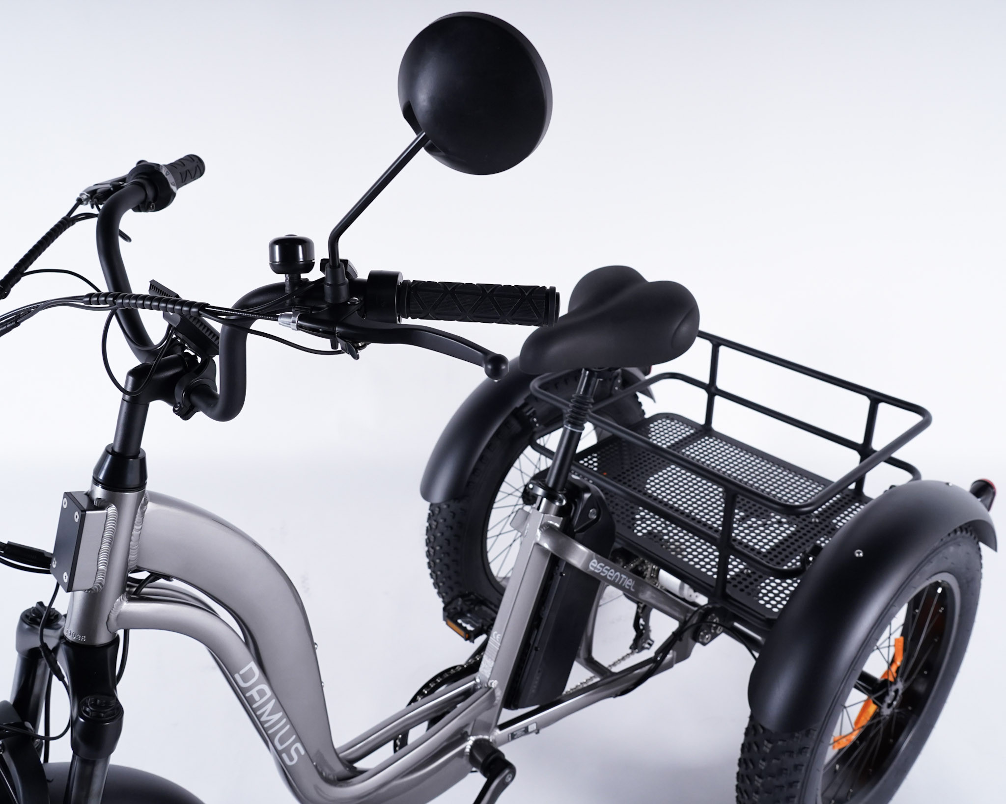 Le tricycle à assistance électrique Essentiel est ici présenté en version tricycle Fatbike. Il s’agit de jantes et de pneus beaucoup plus large que des pneus classique qui procurent un plus grand confort sur sol irrégulier et permettent aussi de rouler facilement dans du sable par exemple ! Avec ce type de pneu, vous pourrez rouler plus confortablement en mode tout-terrain. Mais attention, pour que ces pneus soient réellement efficaces dans ces conditions, il faut que la pression soit plus basse que dans des pneus conventionnels ce qui implique une consommation de batterie un peu plus élevée et un phénomène de « tanguage » plus important, on ne pas tout avoir ! Cependant cela reste minime et avec une pression adéquate (environ 2 bars) vous aurez le meilleur des deux mondes !