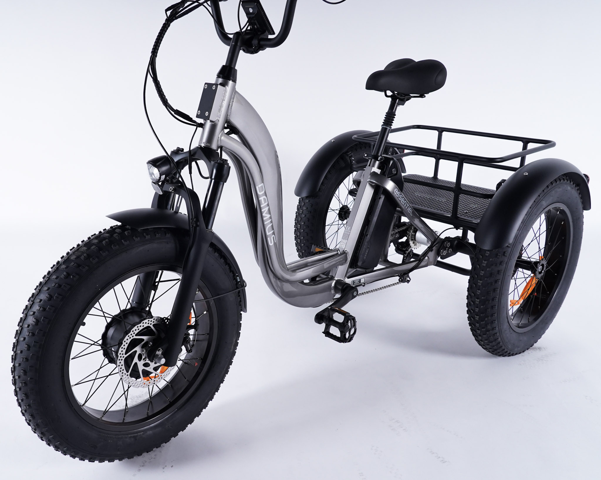 Voici la version FATBIKE du tricycle adulte électrique ESSENTIEL 🙂 D’une grande qualité de fabrication et parfaitement équipé, le tricycle Essentiel Fatbike est équipé d’origine d’une assistance électrique progressive, facile à utiliser et puissante lorsqu’il le faut grâce au moteur Bafang 45Nm placé dans la roue avant. Il bénéficie d’une position de conduite confortable et adaptée même si vous avez des problèmes articulaires, d’un éclairage alimenté par la batterie avec fonction feu stop lorsque vous freinez, de freins à disque avec position parking, d’une fourche avec suspension ainsi que d’une selle confortable et suspendue. Dans le grand panier arrière vous pourrez choisir en option différents accessoires comme une housse isotherme ou un sac de transport pour votre animal de compagnie !