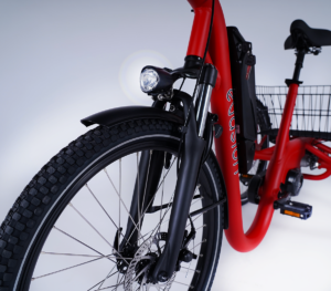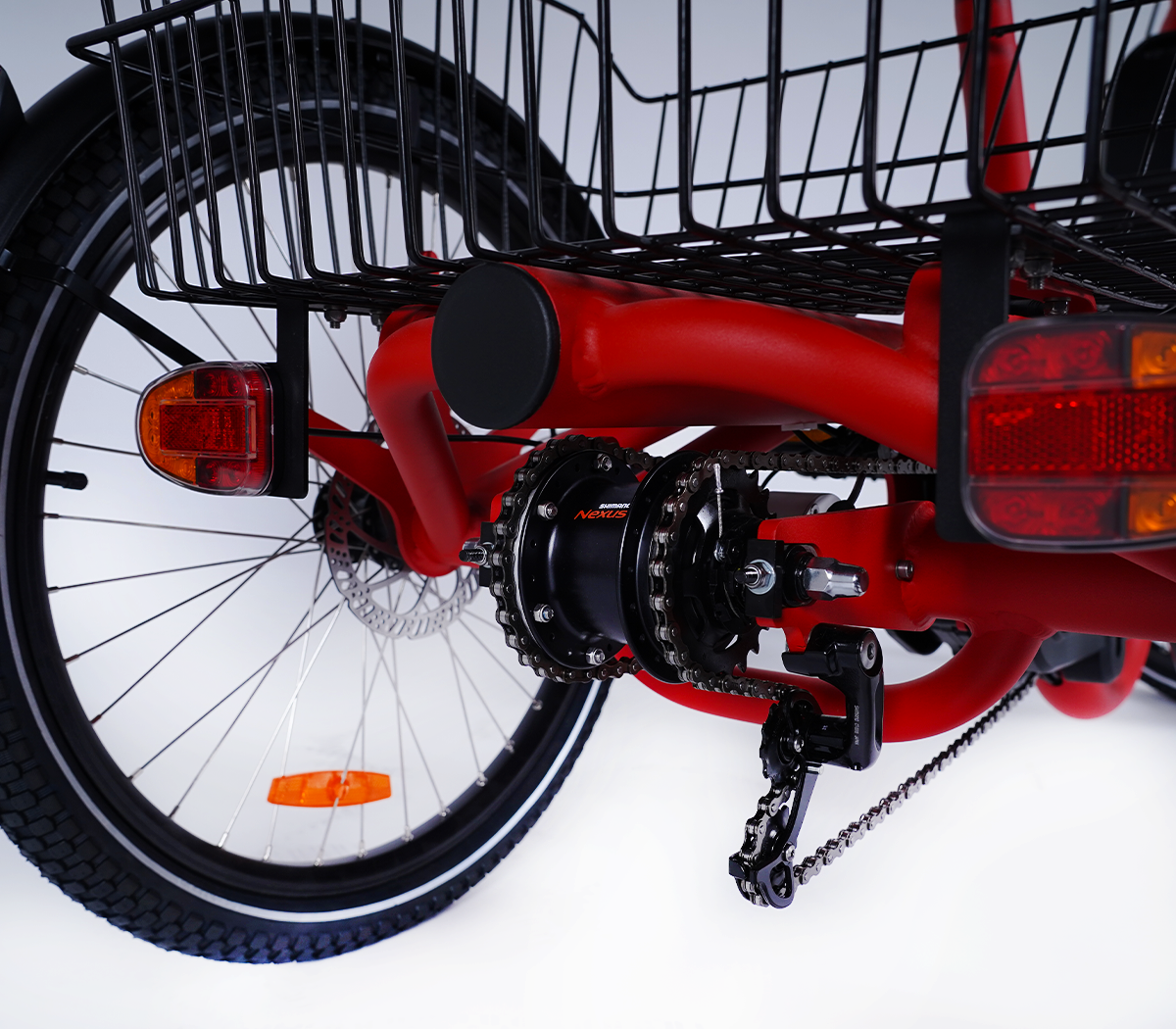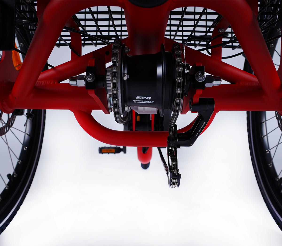 D’origine l’Evasion moteur pédalier se voit équipé d’un différentiel permettant de parfaitement répartir la puissance du moteur et du pédalage aux roues arrières et d’un dérailleur Nexus à 7 vitesses permettant de passer les vitesses à l’arrêt. En plus, avec ce type de dérailleur, impossible de dérailler !